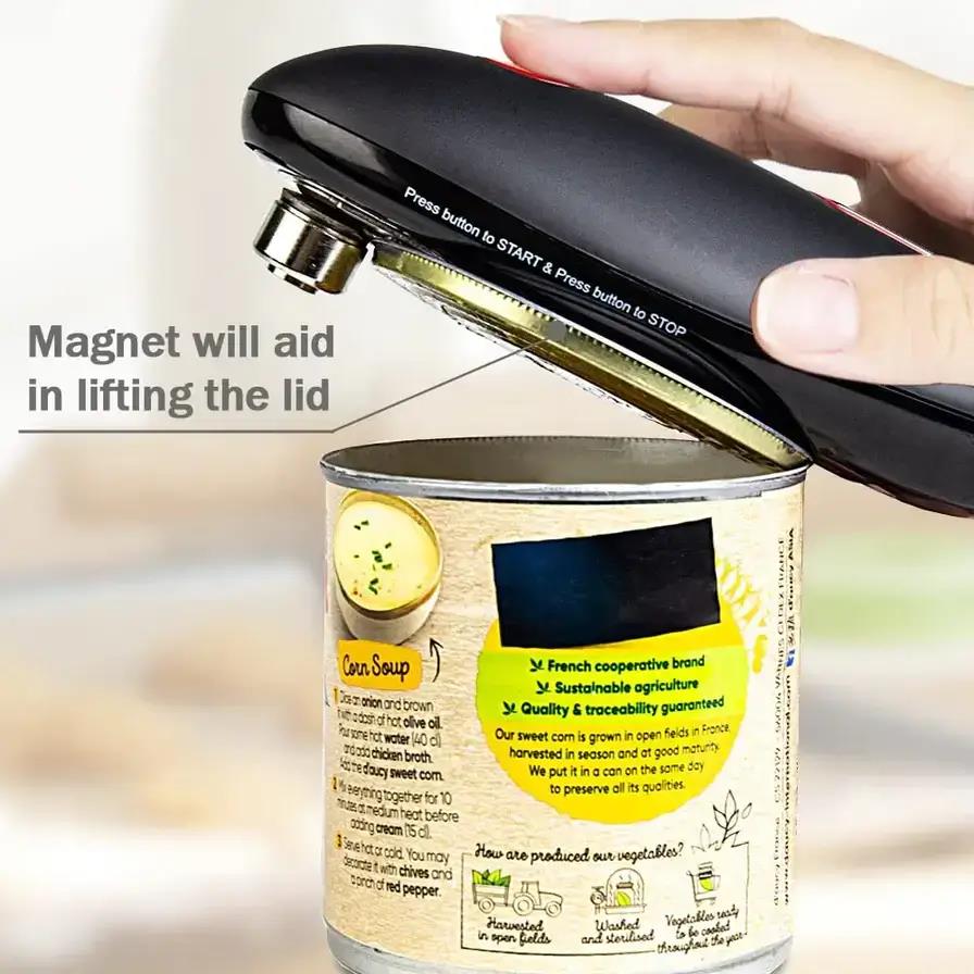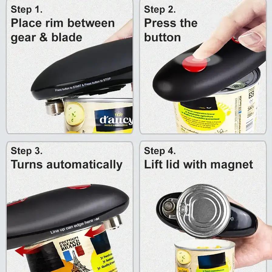 - Easy To Use - Just latch the automatic can opener to the top of a can, touch on the automatic on/off button to turn it on, and watch it do its magic!